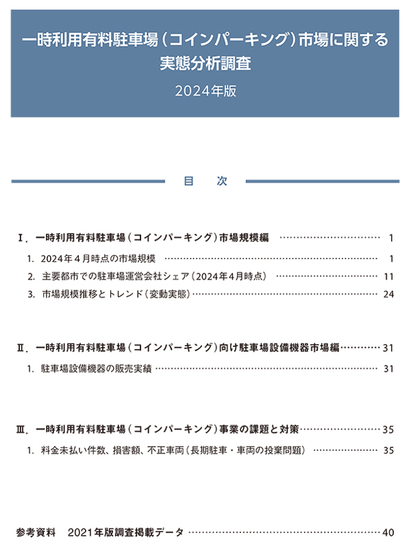 Ⅰ.一時利用有料駐車場( コインパーキング)市場規模編 1.2024年4月時点の市場規模 2.主要都市での駐車場運営会社シェア(2024年4月時点) 3.市場規模推移とトレンド(変動実態) Ⅱ.一時利用有料駐車場(コインパーキング)向け駐車場設備機器市場編 1.駐車場設備機器の販売実績 Ⅲ.一時利用有料駐車場(コインパーキング)事業の課題と対策 1.料金未払い件数、損害額、不正車両(長期駐車・車両の投棄問題) 【参考資料 2021年版調査掲載データ】 A.一時利用有料駐車場(コインパーキング)向け駐車場設備機器市場編 1.駐車場設備機器の販売実績 2.ロック板、ロックレス、ゲート機、精算機別メーカーシェア(2020年) 3.車番認識システムについて B.一時利用有料駐車場(コインパーキング)事業の課題と対策 1.料金精算機のキャッシュレス化の状況 2.ハンディキャップ専用駐車スペースの対応状況 C.カーシェアリング市場規模編 1.2021年4月時点の市場規模 2.カーシェアリング運営会社別シェア 3.市場規模推移とトレンド D.一時利用有料駐車場(コインパーキング)の料金 1.コインパーキング料金調査概要 お申込はこちら |