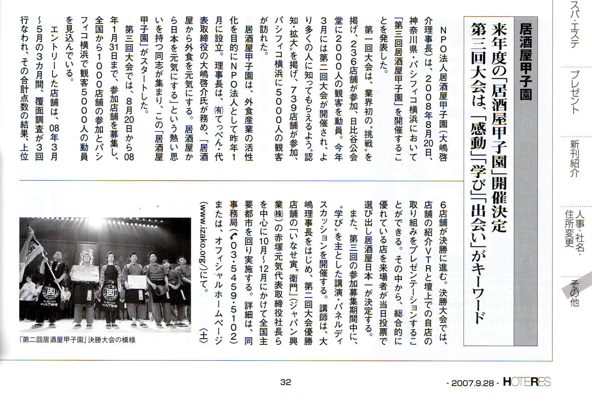 2007年9月28日号『週刊ホテルレストラン』に第三回居酒屋甲子園の記事が掲載されました!