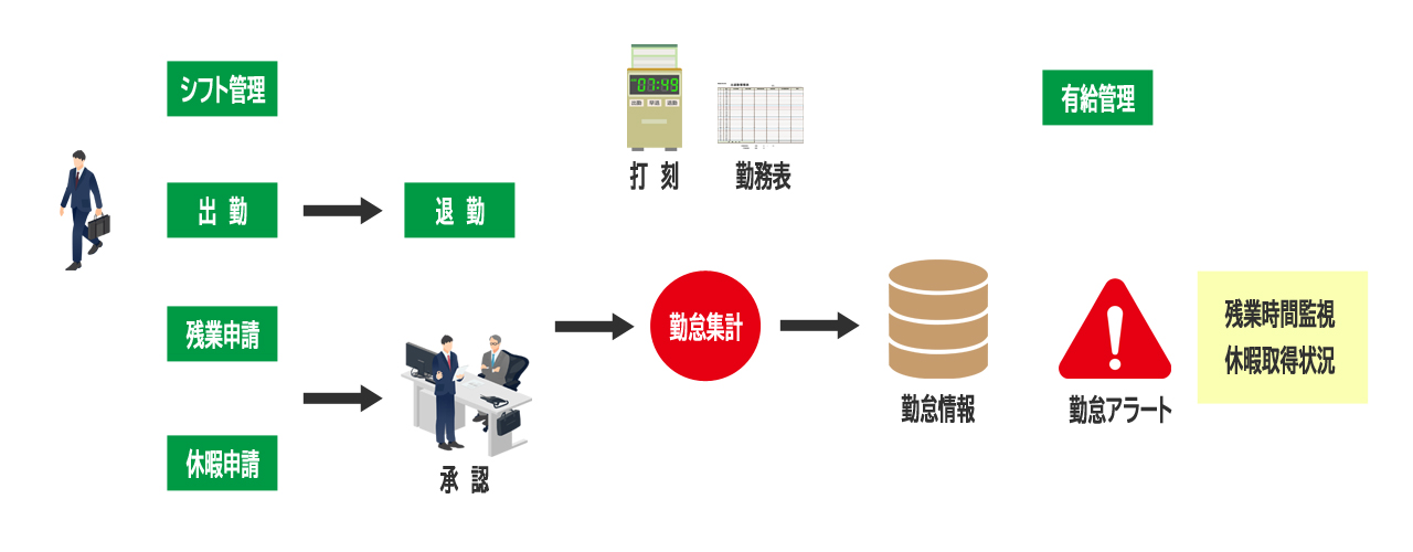 日々の勤怠情報から残業、休日出勤、契約関連などの設定値に該当する勤務状況に対してアラートを出すことができます。管理者はアラート内容によって早期の対応をとることができます。