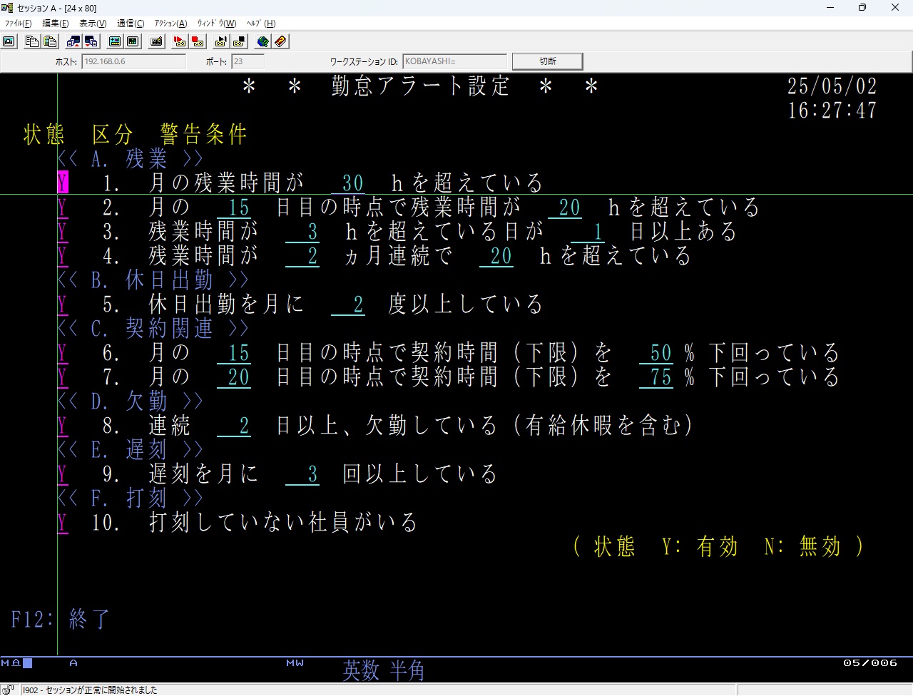 残業時間、休日出勤、契約条件、欠勤、遅刻など設定した値を超過したり、満たない場合にアラートを出す機能です。問題の早期発見、早期対応をとることができます。