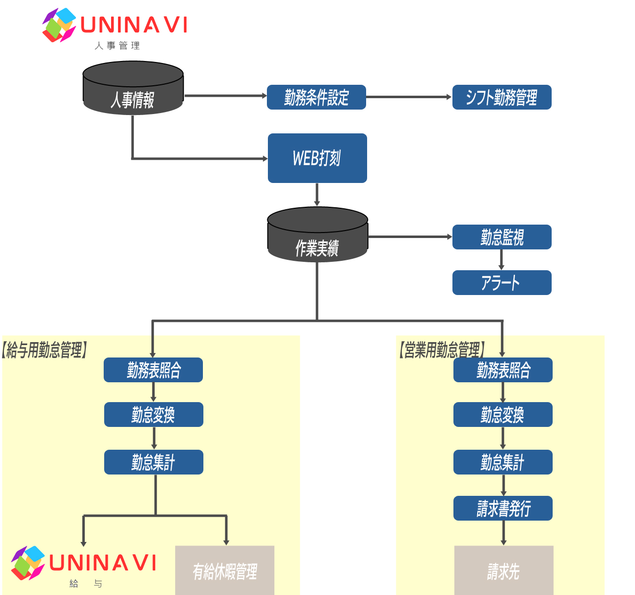 UNINAVI人事管理、UNINAVI給与システムとの連携することで、従業員情報や勤怠情報がそのまま給与計算に利用できます。データ入力の手間がかからず短時間、少人数で勤怠業務をおこなえます。