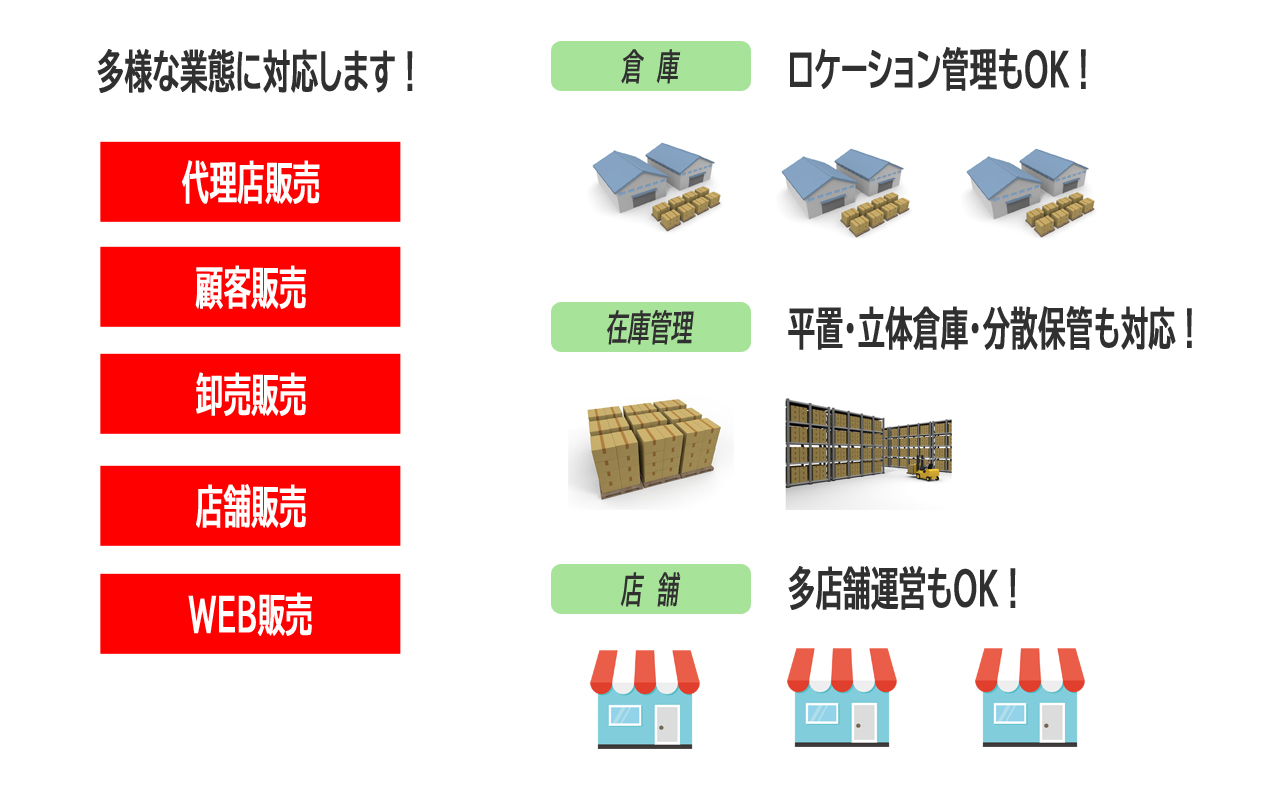 販売管理といっても、代理店販売、通常顧客販売、卸売販売、店舗販売、WEB販売と様々な販売形態があります。当システムではこれらの業態に対応し、複数の販売チャネルを一元管理することができます。